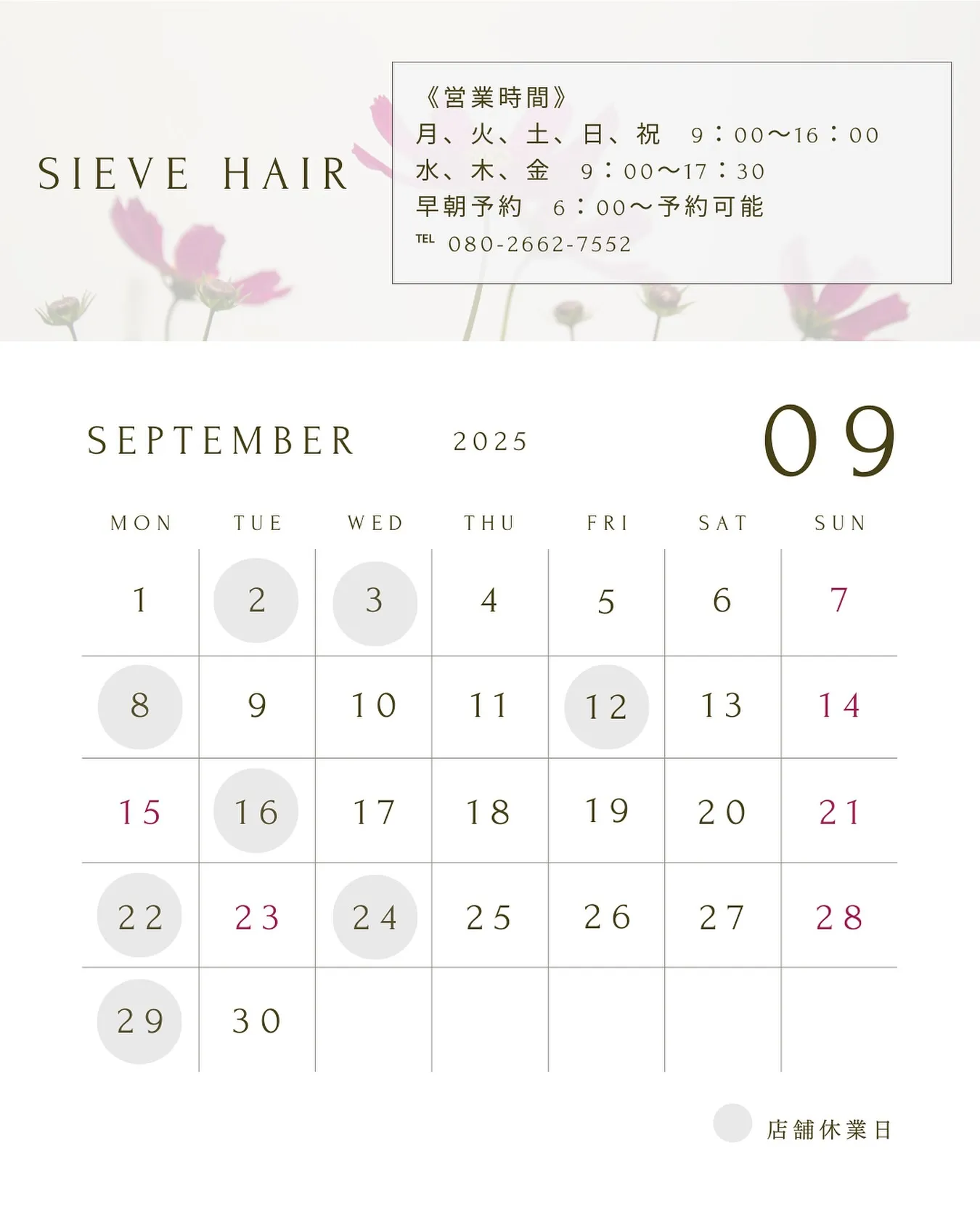 《早朝営業》【土、日、祝】6:00〜8:30※ヘアセット、着付けのみのご予約可能 Close 不定休